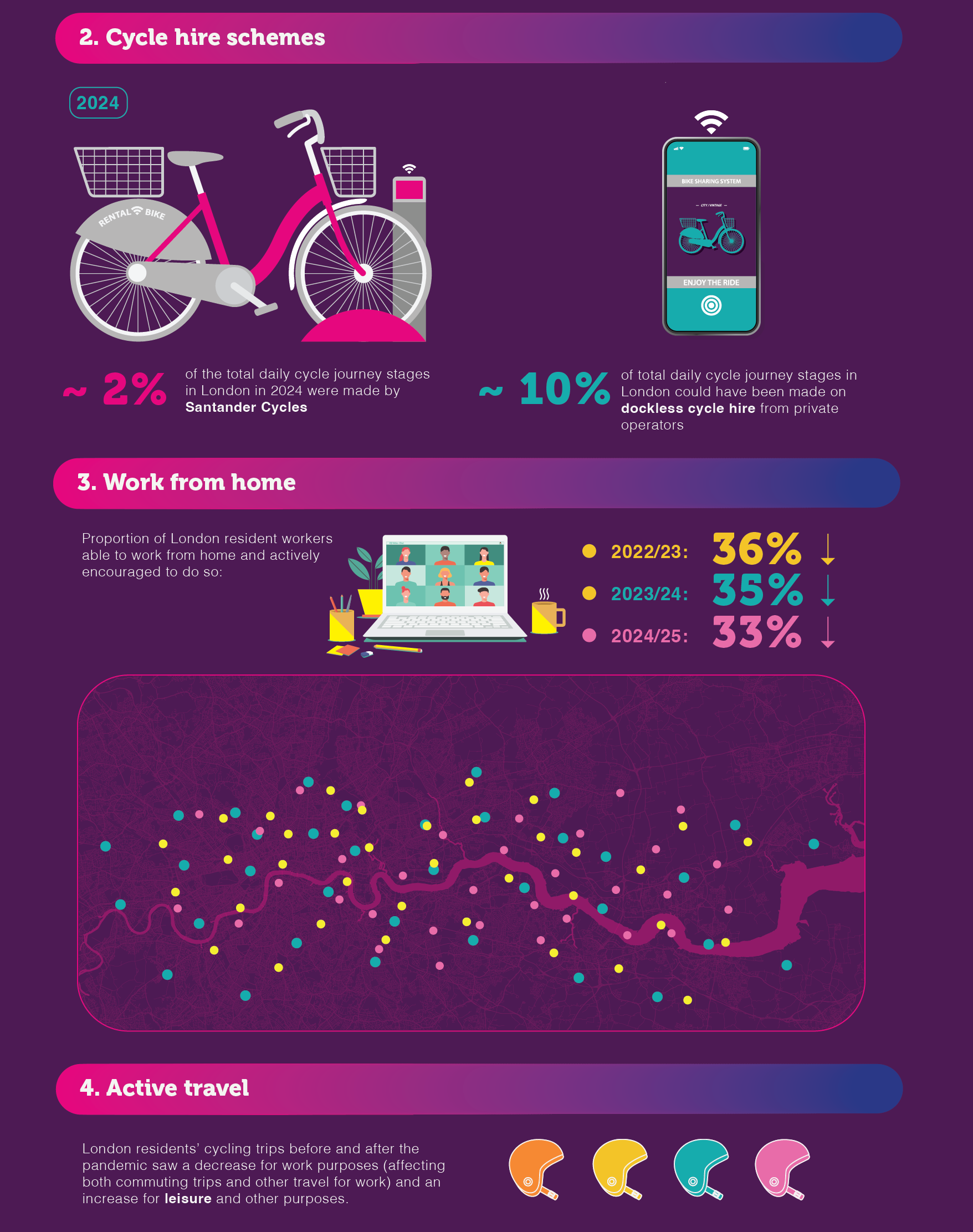 It is also worth noting the growing role of cycle hire in the number of cycle trips. It is estimated by TfL that 12% of cycling trips are made using hire bikes. These trips, especially concentrated in central London, do not generate demand for long-stay workplace cycle parking.