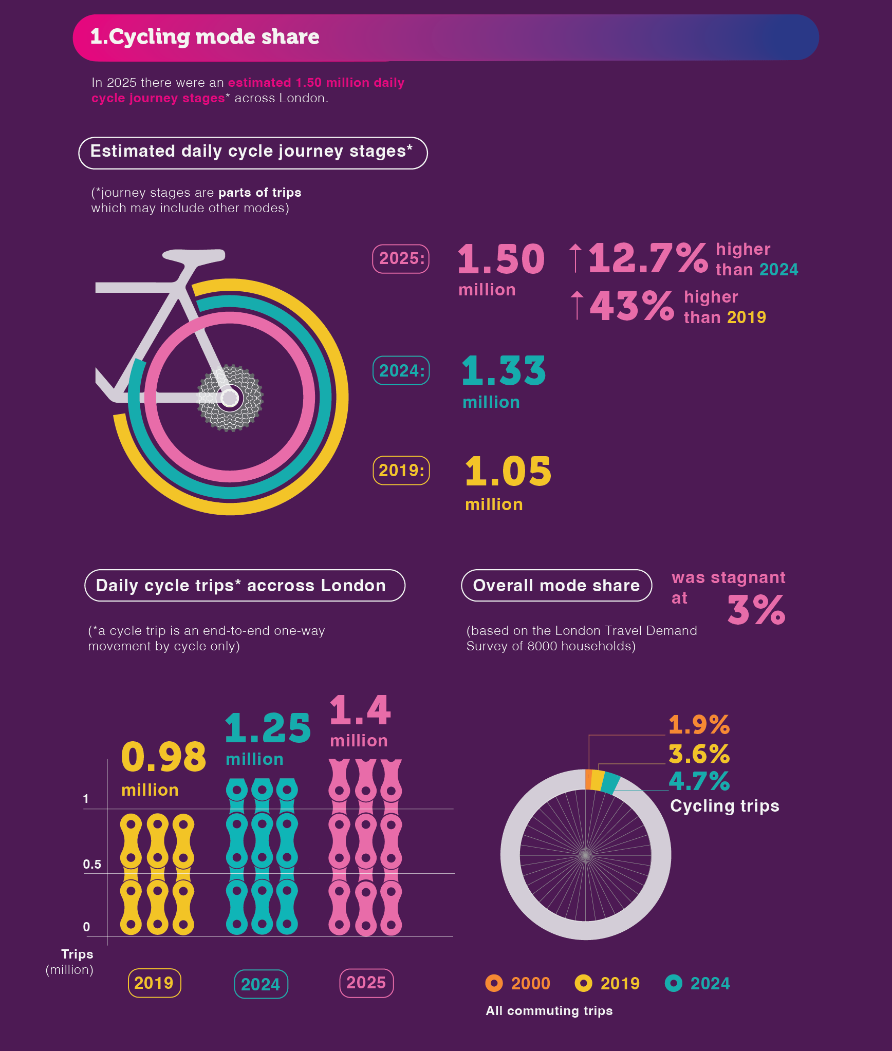 Recent TfL data shows strong growth in cycling. According to the latest Travel in London report, both daily cycle trips (defined as end-to-end journeys made entirely by bike) and cycle stages (where cycling forms part of a longer journey) have increased by almost 45% since 2019. TfL estimates that in 2025 there were around 1.5 million daily cycle stages and 1.4 million daily cycle trips within London.